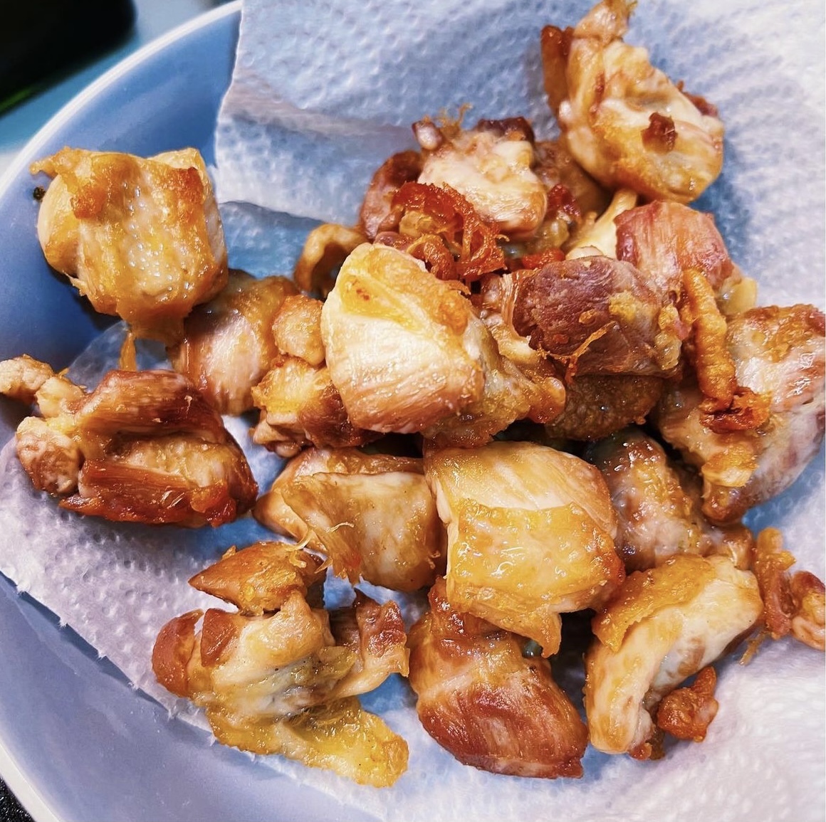 2. 開一鍋油,牛油果油為佳。中火至油滾,下雞塊炸,大概炸10-15分鐘左右。至雞塊金黃,撈起用廚房紙吸去多餘油份。