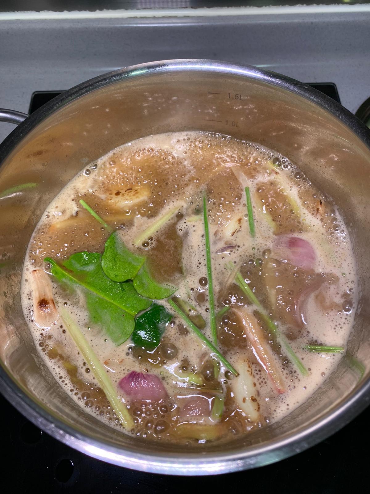 4)將(2)+(3)倒哂落煲同葡汁一齊煮,煮到杰身就可以了