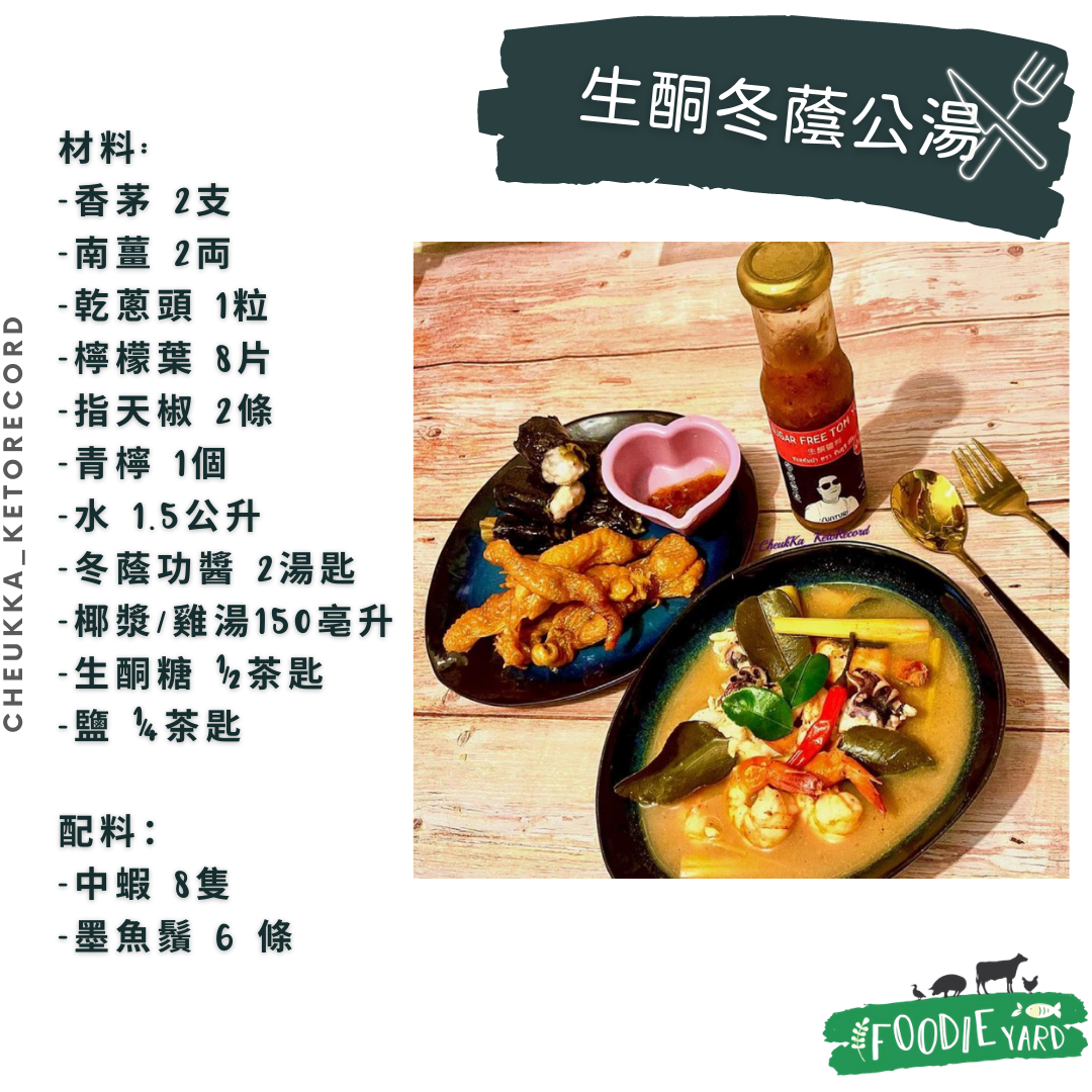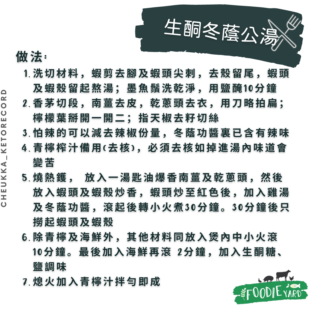 -除青檸及海鮮外,其他材料同放入煲內中小火滾 10分鐘。最後加入海鮮再滾 2分鐘,加入生酮糖、鹽調味