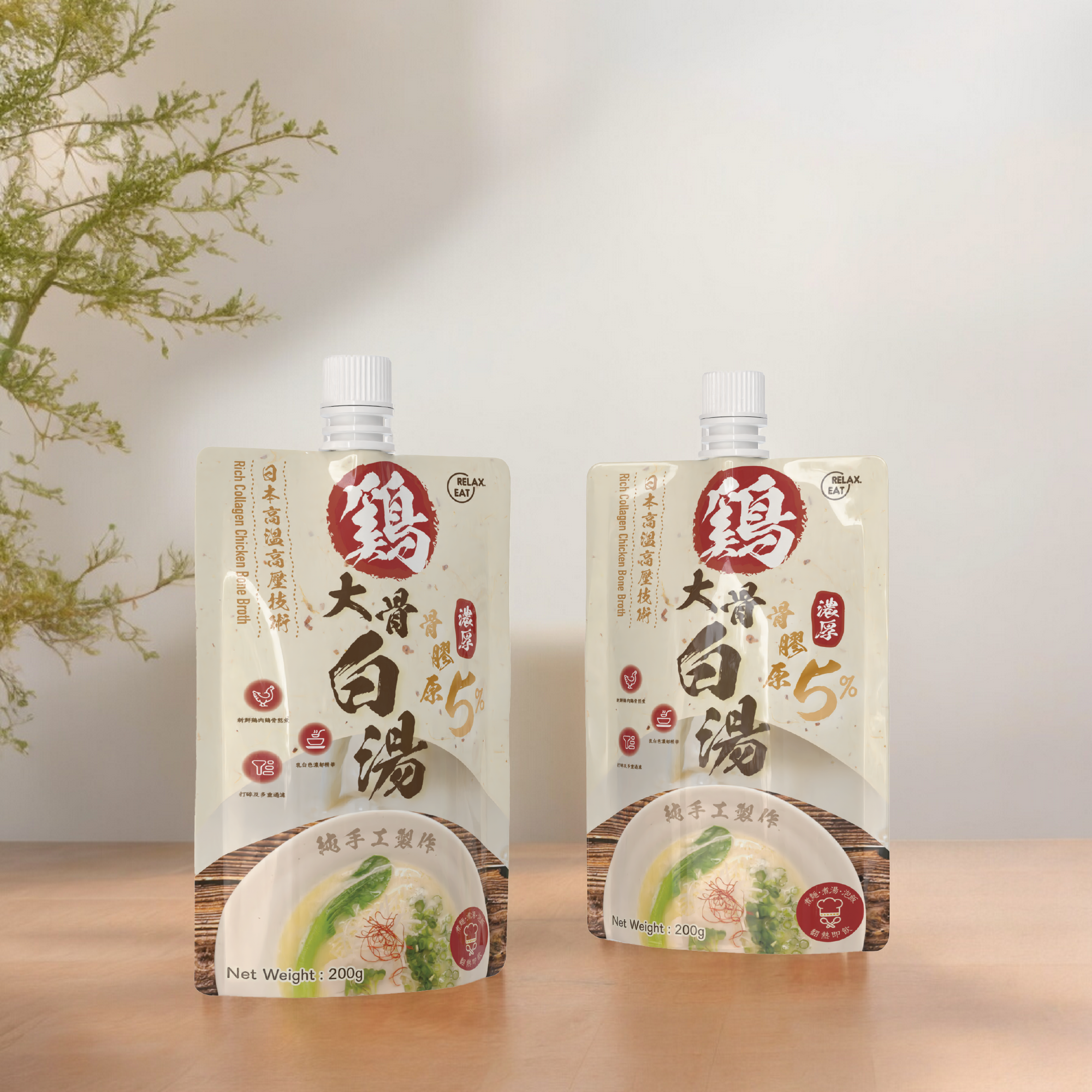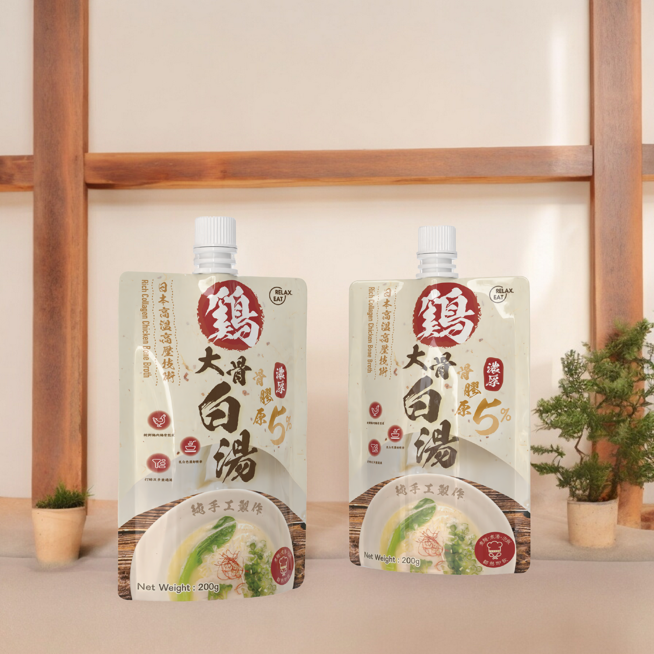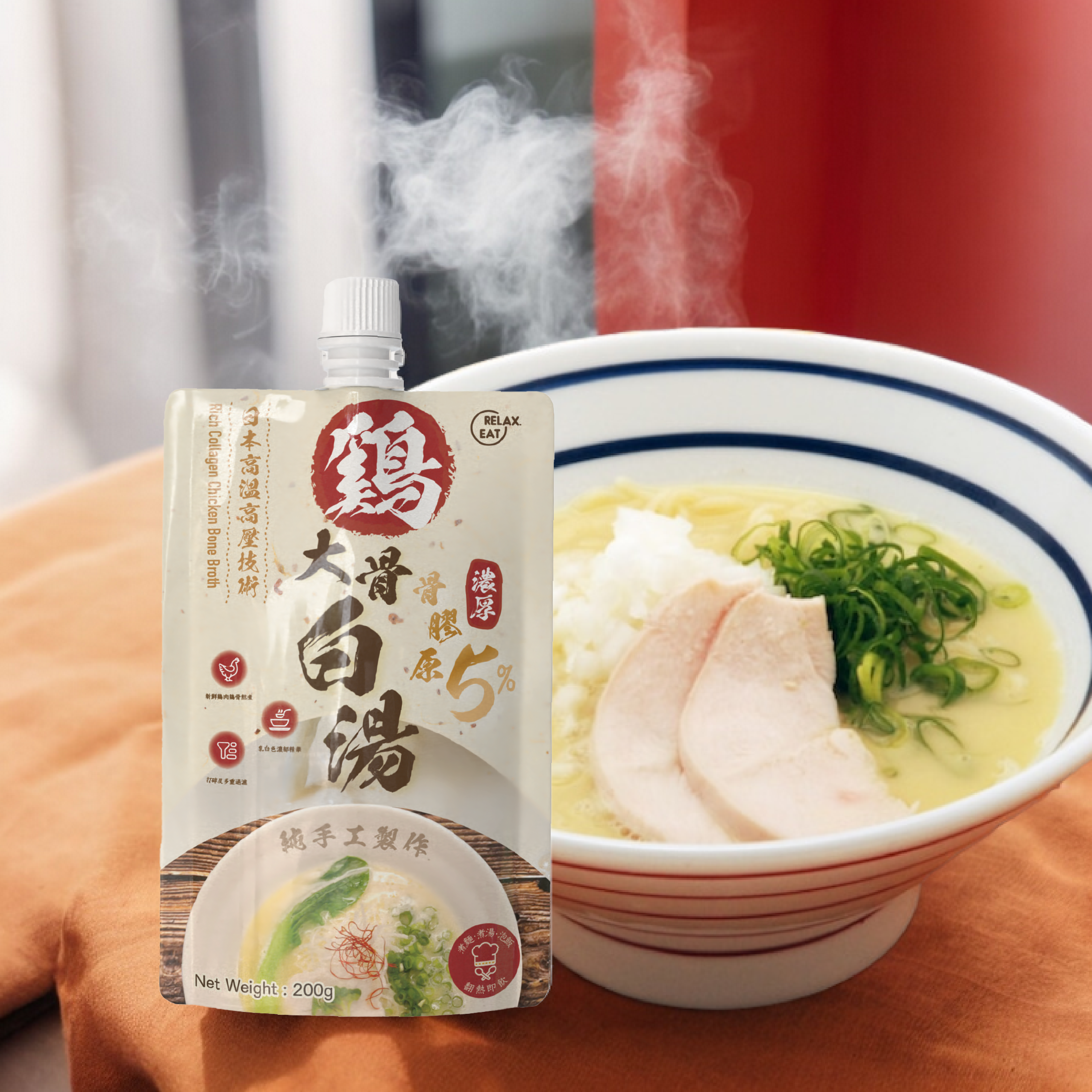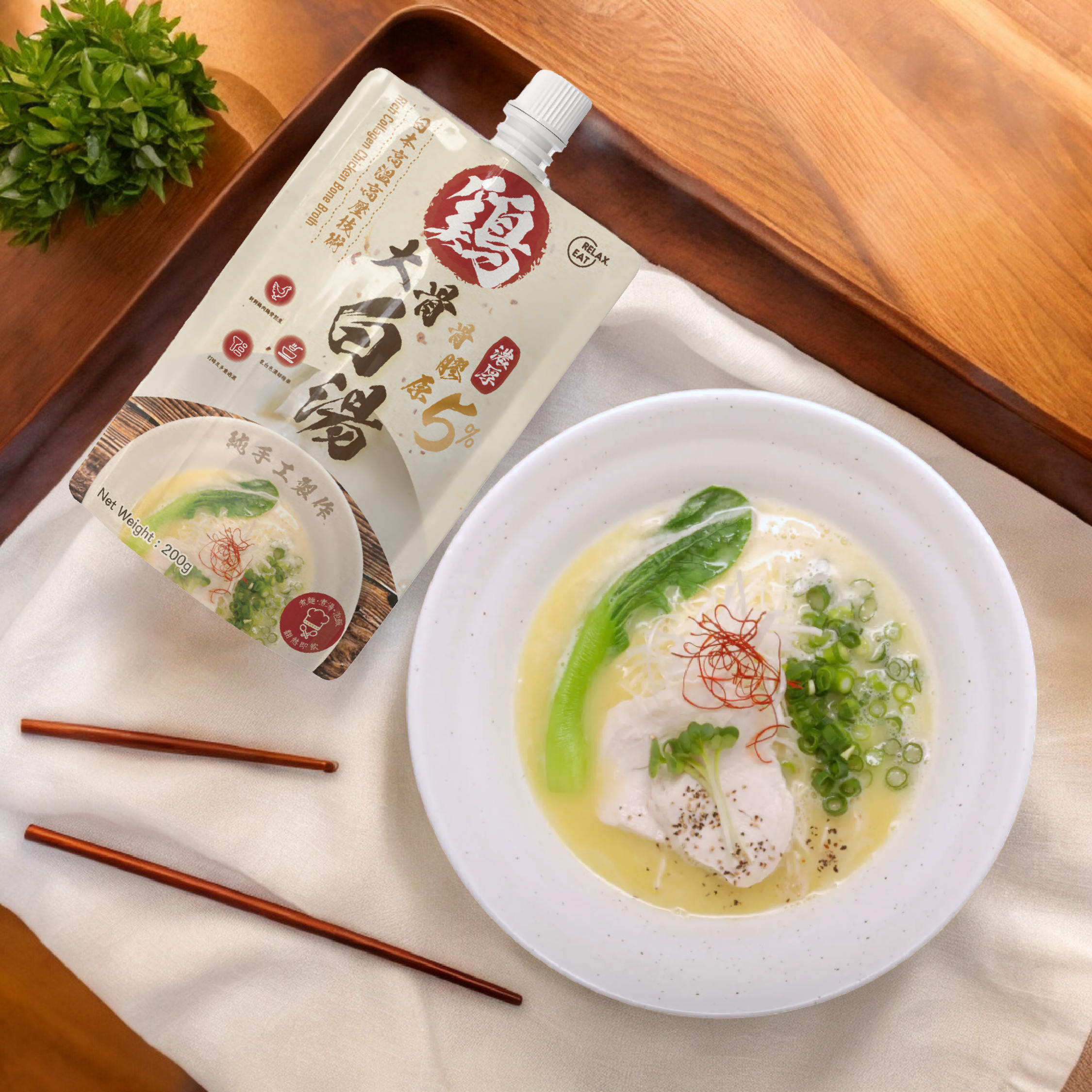 選用大量雞肉及雞腳並以高温及長時間燉煮而成,湯底經過強火熬煮及用力攪拌後,膠質、油脂及水份互相融合,呈現乳化及奶白色,分解的骨頭滲出大量膠原蛋白。最後湯頭經過隔渣步驟,一碗乳白香順且幼滑細緻的濃厚雞白湯就此完成。